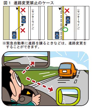 道路交通法において、「車は、みだりに進路を変更してはいけない」ことが定められています。「みだりに」とは、「正当な理由がないにもかかわらず」という意味です。例えば、追越し(追越しが禁止されていない場所に限ります。)のための進路変更は正当な理由として認められますが、単に隣の車線が空いているからという理由での進路変更は認められないと考えられます。また、進路を変更すると、後方からくる車が急ブレーキや急ハンドルで避けなければならない場合や、図1に示した車両通行帯のある場所での進路変更は禁止されています。追越しや右左折のために進路変更をする場合は、その3秒前に合図を出し、禁止場所でないことを確認したうえで、バックミラーや目視により後方の安全を確かめてから行いましょう。
