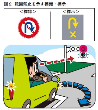 転回(Uターンとも言います。)は、図2に示した標識や標示のある場所や、歩行者の通行やほかの車などの正常な通行を妨げるおそれがあるときは禁止されています。転回する場合は、禁止場所でないことを確認したうえで、前方の車両や歩行者、後方からくる車両の有無などを確かめてから行いましょう。
