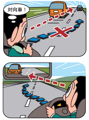 片側1車線の道路では、対向車との衝突という非常に大きなリスクを伴います。追越しには長い距離が必要となるため、対向車がいるときの追越しは避けましょう。